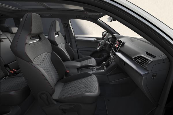 Het interieur van de SEAT Tarraco FR is eveneens uitgesproken sportief. Dat begint al bij de standaard sportieve kuipstoelen met geïntegreerde hoofdsteunen. De bestuurdersstoel is elektrisch verstelbaar en heeft een geheugenfunctie. Alle zitplaatsen zijn bekleed met een speciale, hoogwaardige stof in sportief-luxe motieven en zijn afgewerkt met rode stiksels. Ook heeft de FR het nieuwe multifunctionele stuur, uitgevoerd met leer en FR-logo. De aluminium pedalen en zwarte hemelbekleding maken het sportieve interieur helemaal af. Het hightech karakter komt tot uiting in de standaard Virtual Cockpit, een infotainmentsysteem met 8,25 inch display, Full Link smartphone-integratie en alle online mogelijkheden van SEAT CONNECT. Geavanceerde assistentiesystemen als vermoeidheidsherkenning, Lane Assist, Front Assist inclusief City-noodremfunctie en Multi Collision Brake dragen bij aan veiligheid van topklasse.